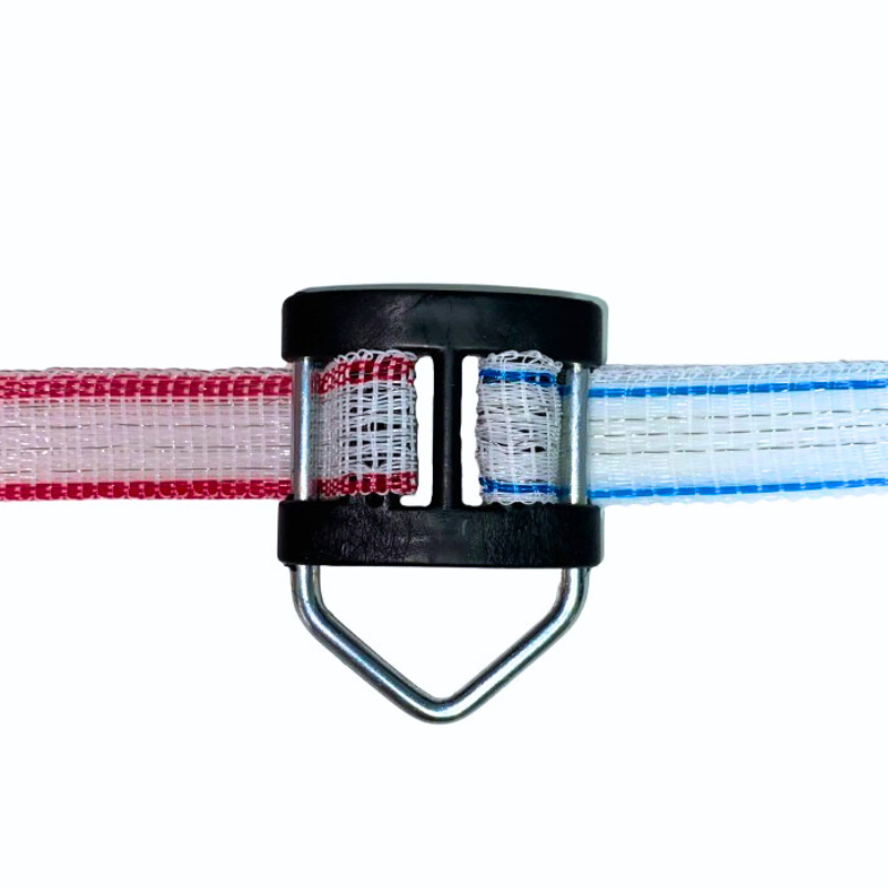 Łącznik do taśmy pastucha 20 mm umożliwia szybkie i trwałe łączenie taśm w ogrodzeniu elektrycznym. Dzięki ocynkowanym elementom metalowym oraz wytrzymałemu tworzywu zapewnia stabilne przewodzenie prądu oraz łatwe napinanie taśmy bez użycia narzędzi.