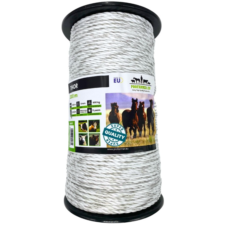 Plecionka THOR charakteryzuje się wytrzymałością na zerwanie aż do 600 kg, dlatego dobrze sprawdza się w ogrodzeniach dla dużych i silnych zwierząt. Lina jest odporna na uszkodzenia mechaniczne, a jednocześnie zachowuje elastyczność, co ogranicza ryzyko trwałych uszkodzeń.