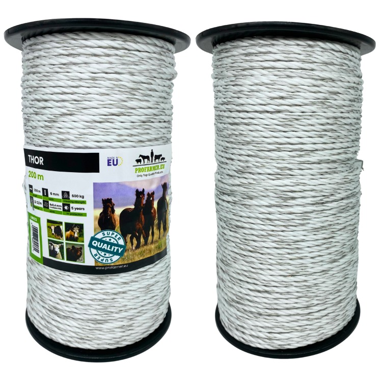 Lina elektryczna THOR 6 mm 200 m została zaprojektowana z myślą o użytkownikach, którzy oczekują solidnego i niezawodnego ogrodzenia elektrycznego, dlatego doskonale sprawdza się w hodowli koni oraz innych dużych zwierząt. Gruba plecionka o średnicy 6 mm zapewnia wysoką odporność mechaniczną, a jednocześnie zwiększa stabilność całej instalacji.