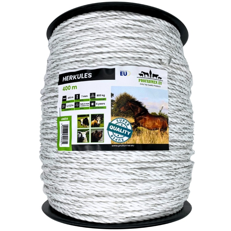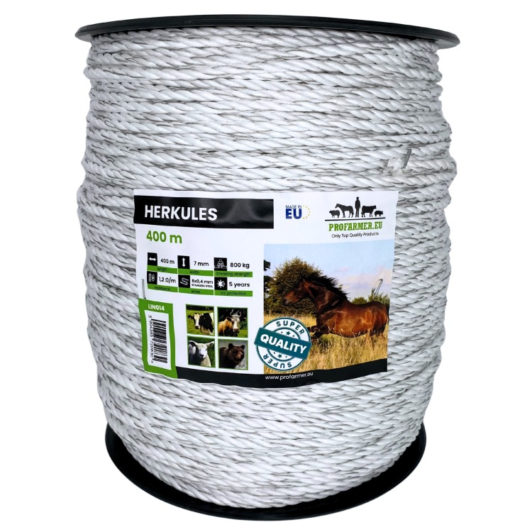 Lina do ogrodzeń elektrycznych HERKULES 7 mm 400 m została zaprojektowana z myślą o użytkownikach, którzy potrzebują bardzo wytrzymałego ogrodzenia. Linka doskonale sprawdza się przy budowie krótkich i średnich ogrodzeń elektrycznych na większym obszarze. Gruba plecionka o średnicy 7 mm zapewnia stabilność całej instalacji, a jednocześnie zwiększa bezpieczeństwo codziennego użytkowania.