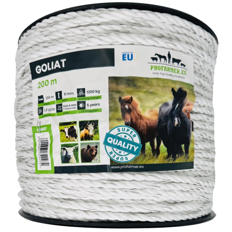 Plecionka GOLIAT wyróżnia się wytrzymałością na zerwanie aż do 1200 kg, dlatego jest jedną z najmocniejszych lin dostępnych do ogrodzeń elektrycznych. Ponadto lina jest elastyczna, a jednocześnie bardzo odporna na uszkodzenia mechaniczne.
