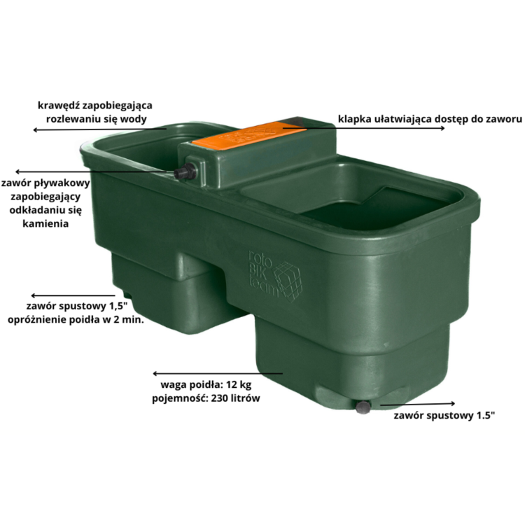Poidło dla koni 230l to trwałe, dwukomorowe poidło pastwiskowe z zaworem pływakowym. Zapewnia stały dostęp do świeżej wody, a jednocześnie ogranicza jej marnowanie.
