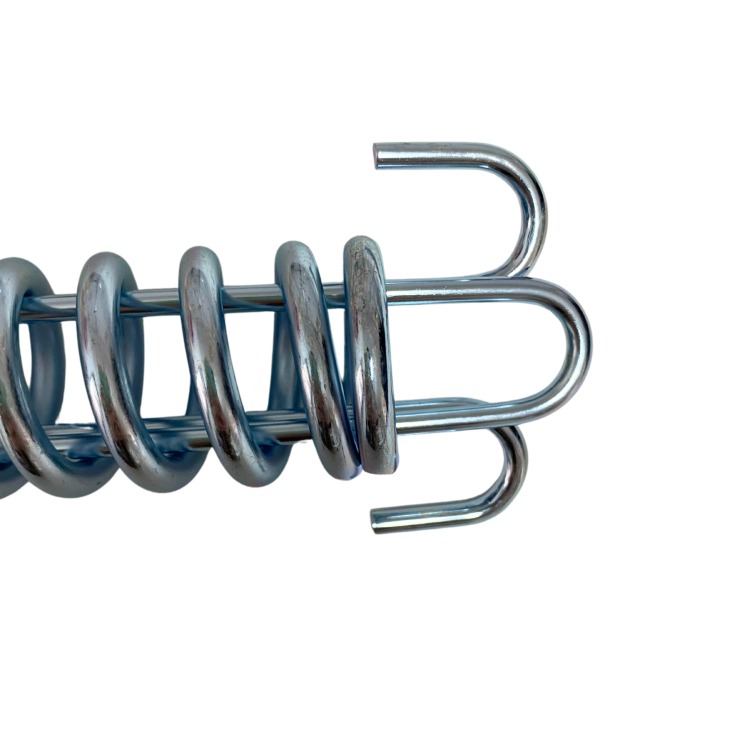 Sprężyna naciągowa została wykonana z ocynkowanego drutu stalowego o grubości 5 mm, dlatego element zachowuje wysoką odporność na korozję, wilgoć oraz zmienne warunki pogodowe. Dzięki temu użytkownik może stosować sprężynę przez cały rok, zarówno na otwartych pastwiskach, jak i w ogrodzeniach stałych.